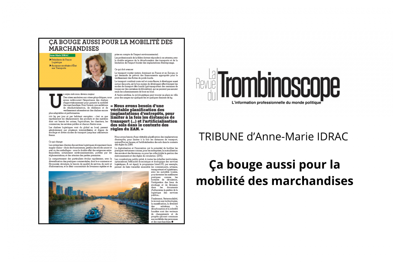 Juin 2024 : Dans la nouvelle revue du Trombinoscope, Anne-Marie IDRAC, Présidente de France Logistique, revient sur les enjeux de la filière du transport de marchandises et sur les leviers à actionner pour renforcer le secteur.