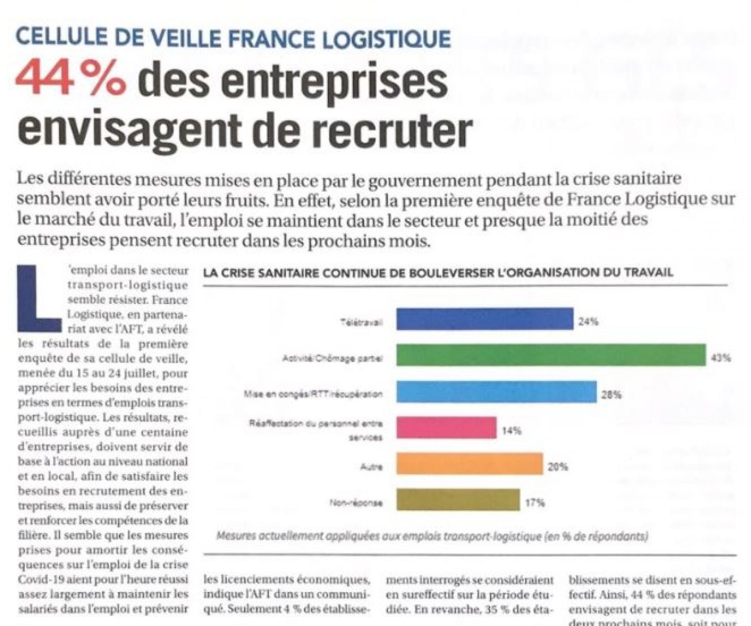 Enquêtes 20 Oct 2020 Résultats de la 2e enquête AFT/France Logistique sur les besoins en recrutement Transport-Logistique 20 octobre 2020 : Suite à la mise en place d’une cellule de veille de l’évolution des emplois et des…